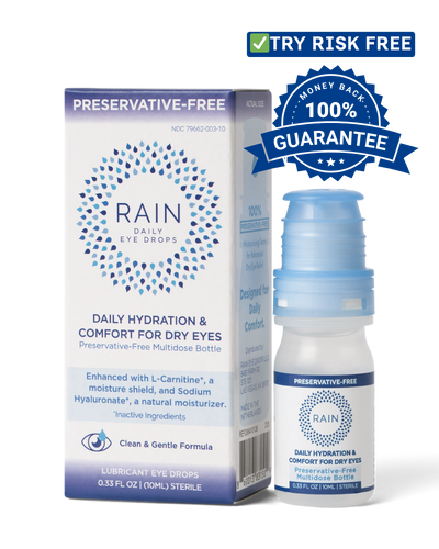 RAIN™ incorporates science-backed ingredients like L-Carnitine to help form a moisture-protective shield over your eye’s surface — supporting hydration and reducing evaporation. Protecting your eye’s moisture layer is the key to lasting comfort. It’s why Rain doesn’t just feel good at first — it keeps your eyes comfortable longer, helping irritation and dry eye scratchiness fade away.