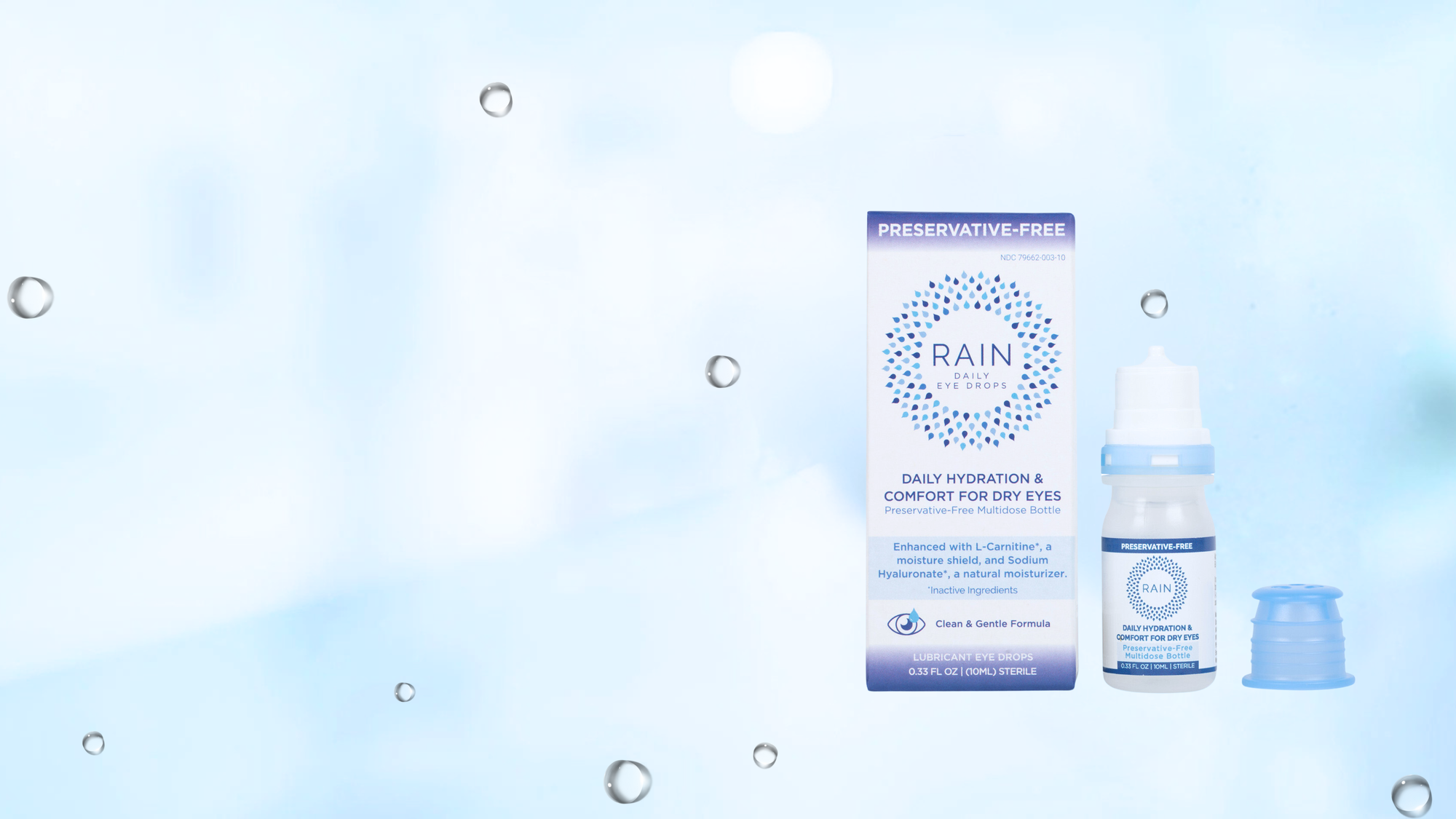 RAIN Daily Eye Drops actually hydrate dry eyes using Sodium Hyaluronate — a natural moisturizer that binds water to the eye’s surface and helps restore lasting hydration. It’s a clean wave of comfort that replenishes and relieves the irritated surface of dry and sensitive eyes.