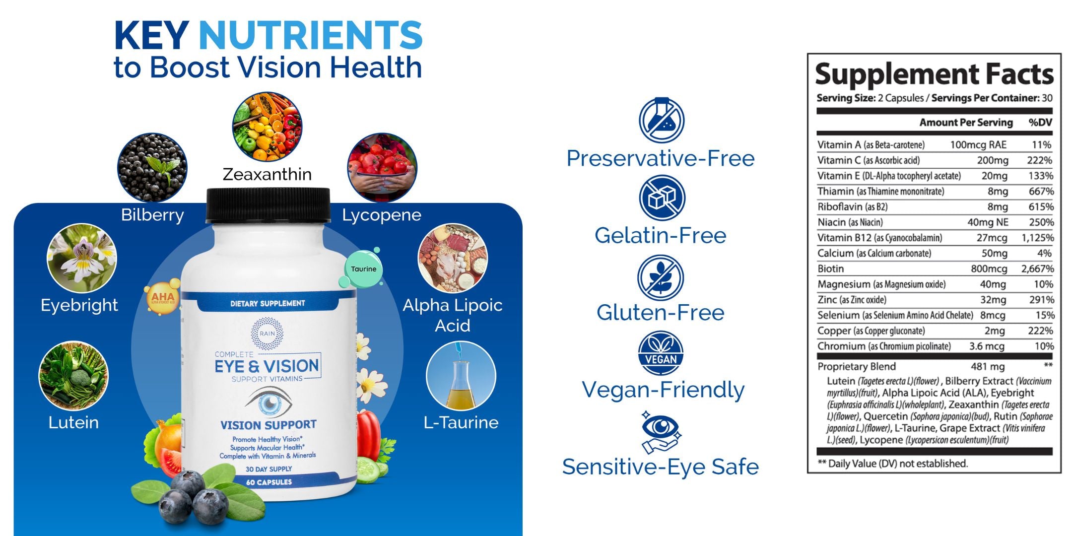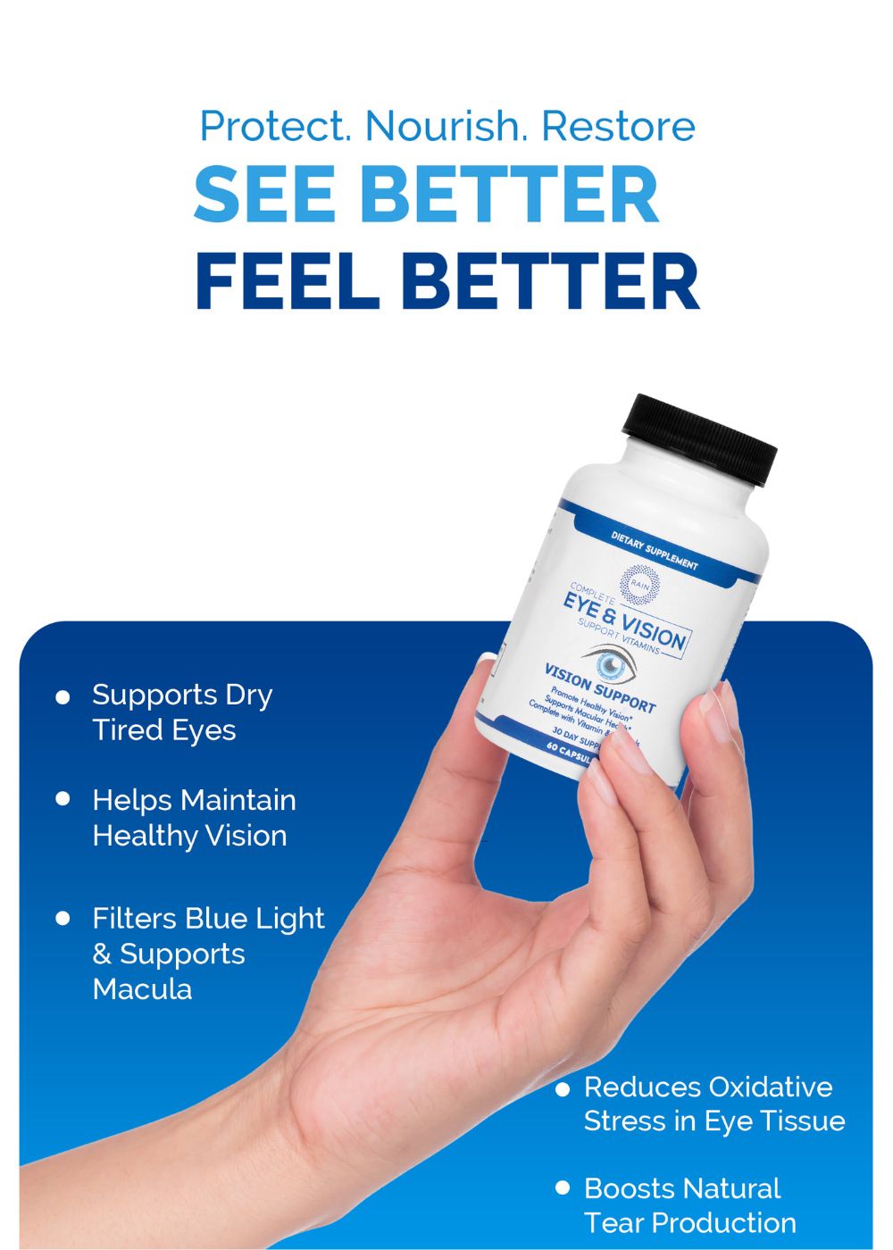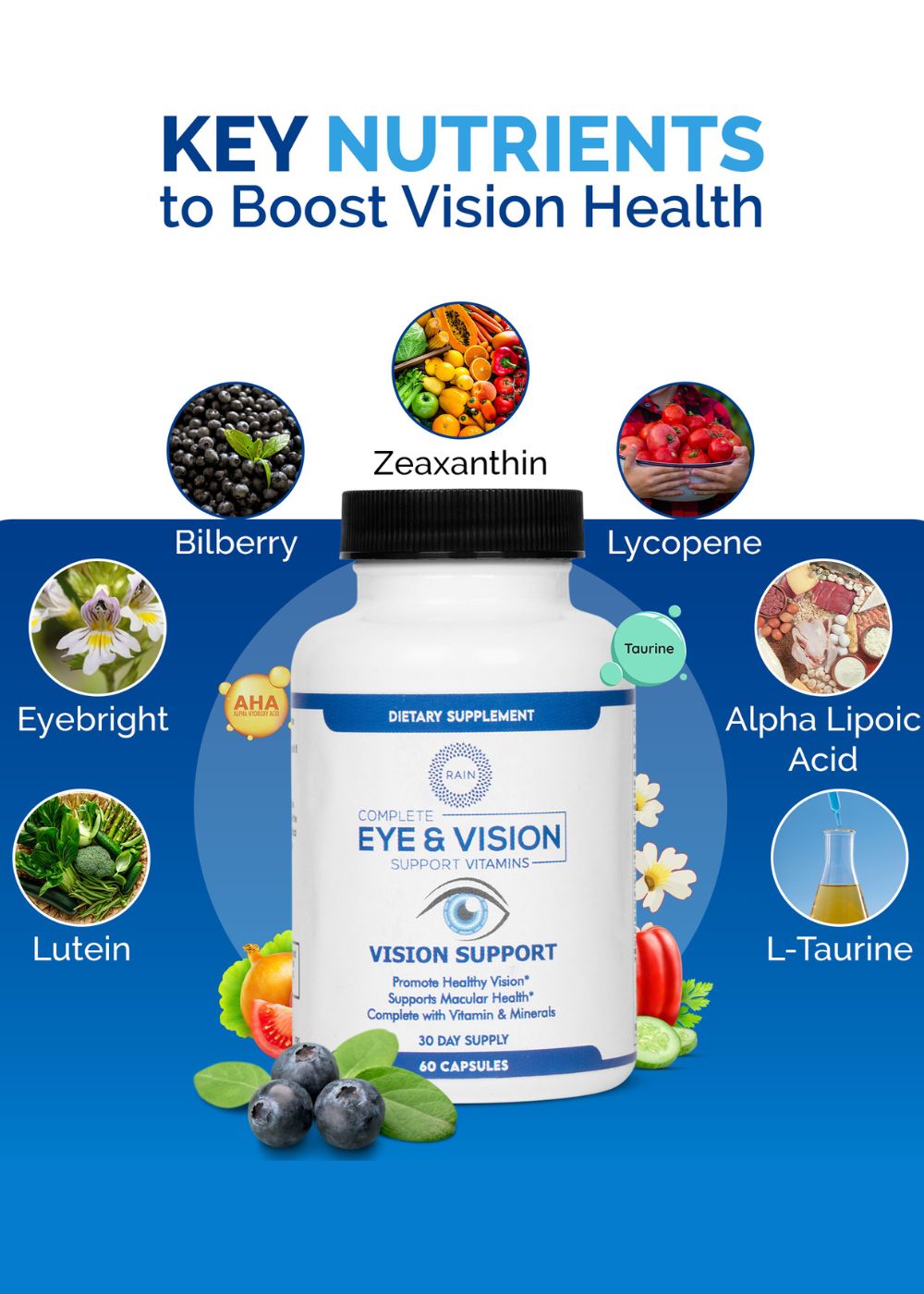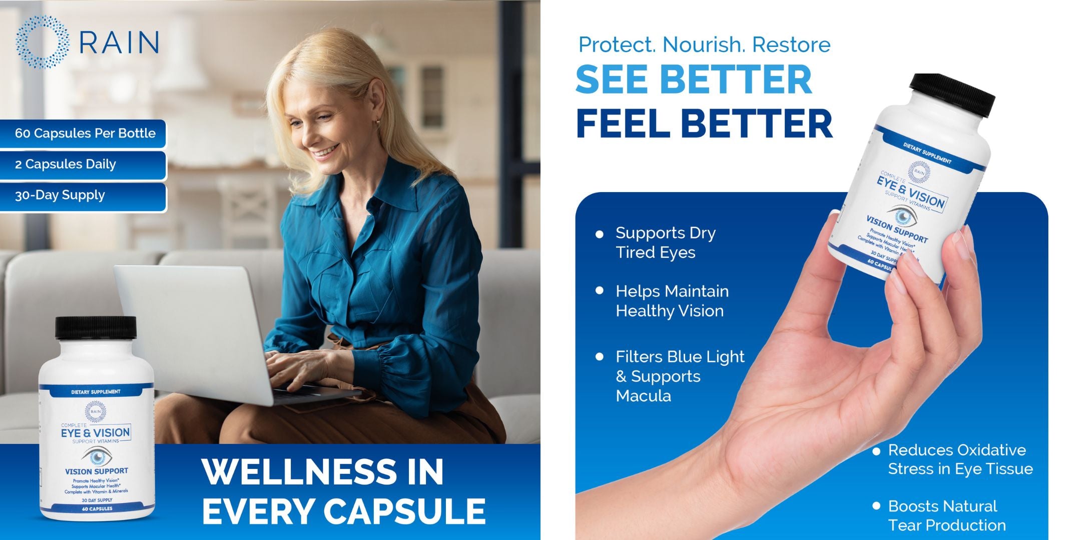 Take our natural eye vitamins with your Rain eye drops toreplenish key eye nutrientsand supporthealthy tear production. Each capsule has 4 powerful eye nutrients packed into one daily vitamin toboost vision health for dry eyes.